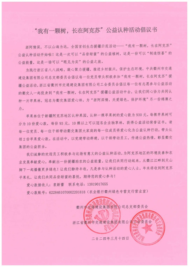 后記:浙江FM93交通之聲代表主辦方對衢交集團的愛心行動表示感謝,電臺工作人員表示主辦方將為公司頒發(fā)“我有一棵樹,長在阿克蘇”公益認種活動榮譽證書,每棵樹將冠名衢交集團小團體的名稱。年末,將為每一位衢交愛心認種人士寄來一份甜蜜的阿克蘇蘋果禮。
